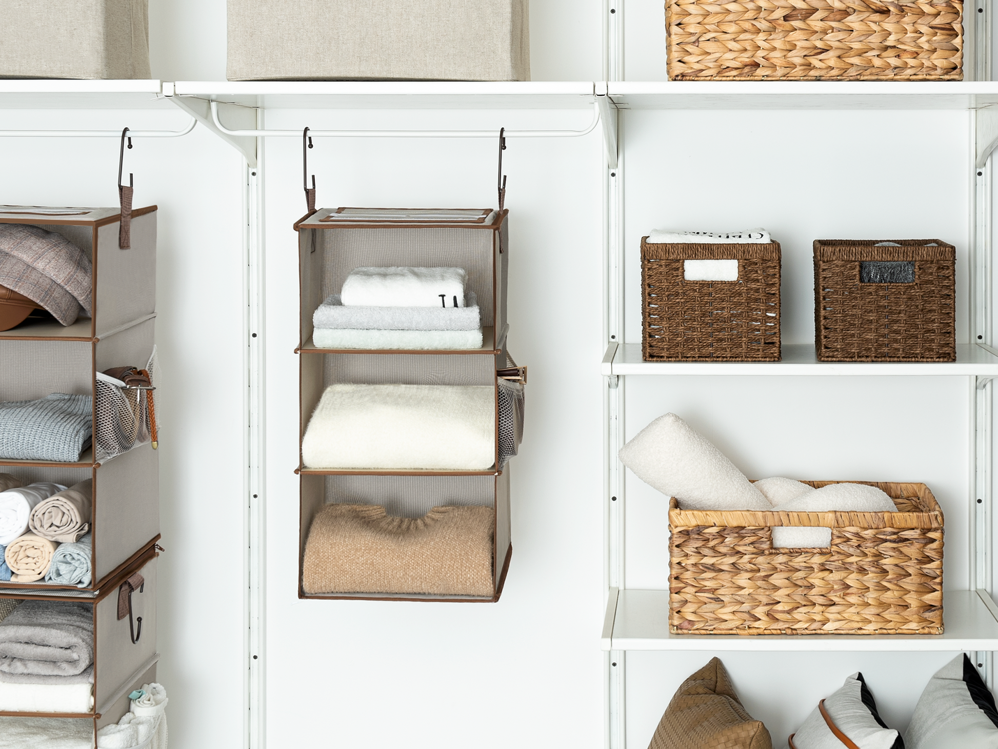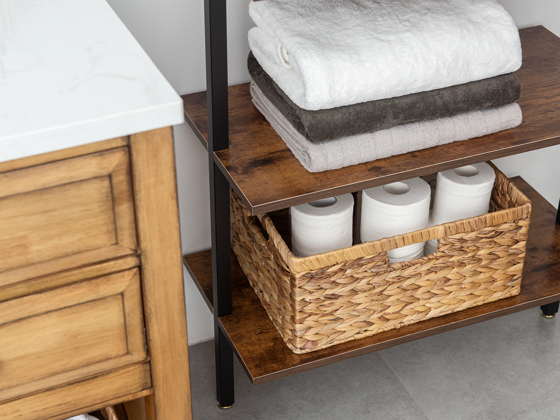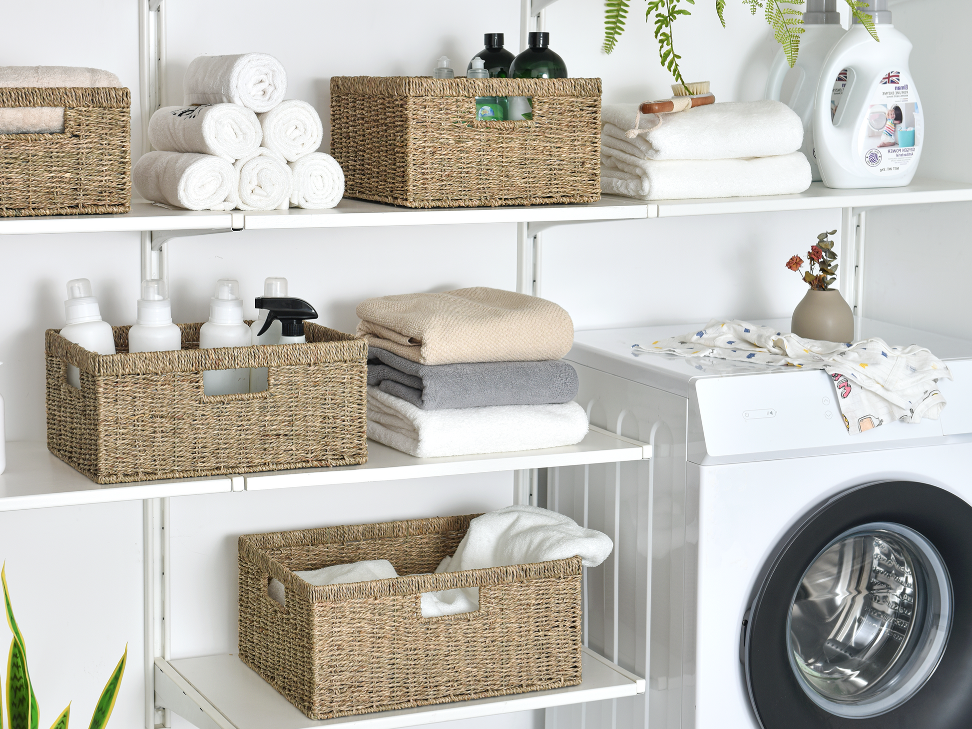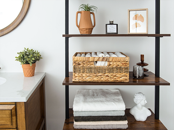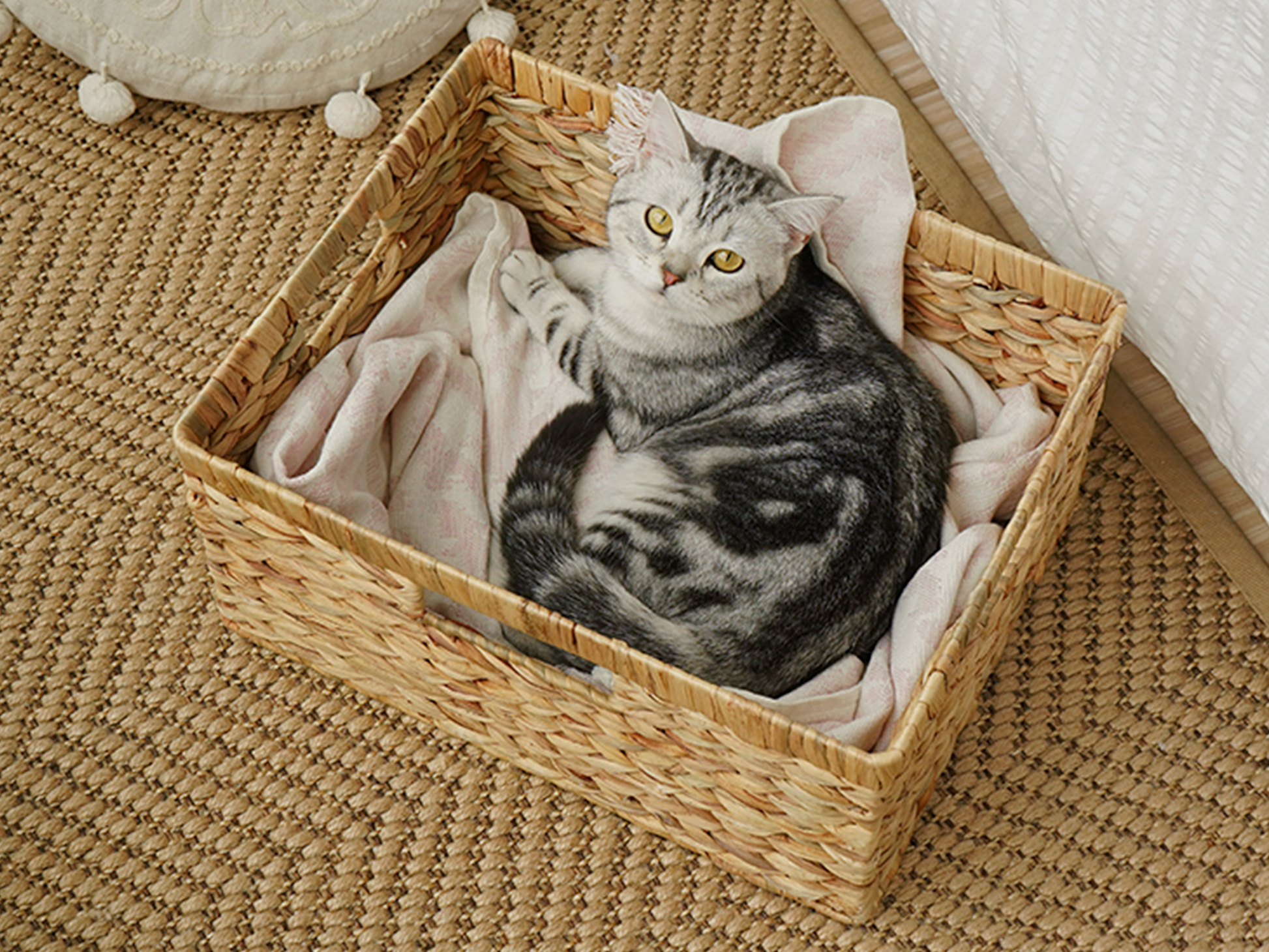 Versatile storage basket for storing towels, blankets, pet toys, and household items.