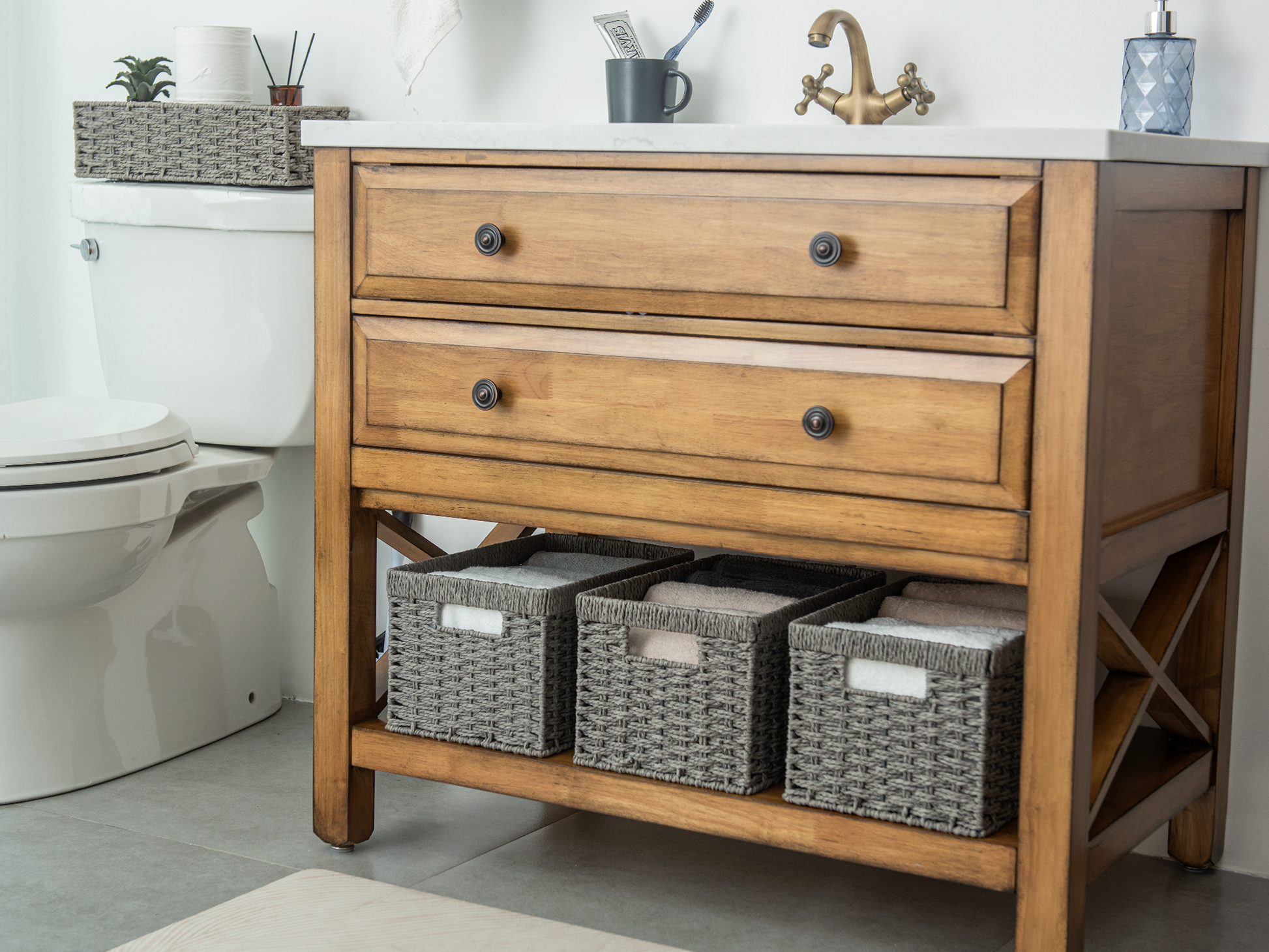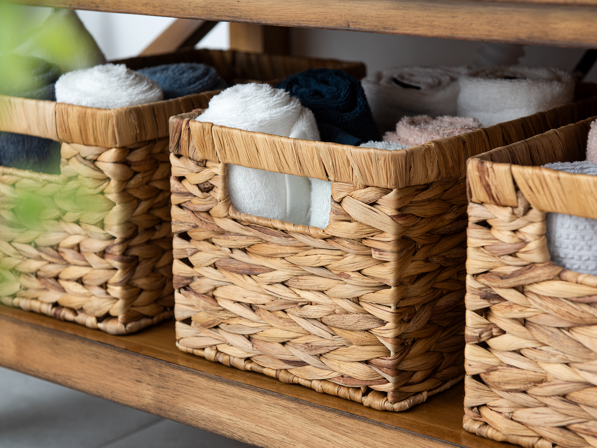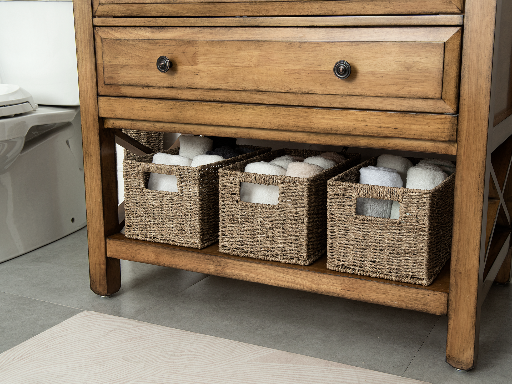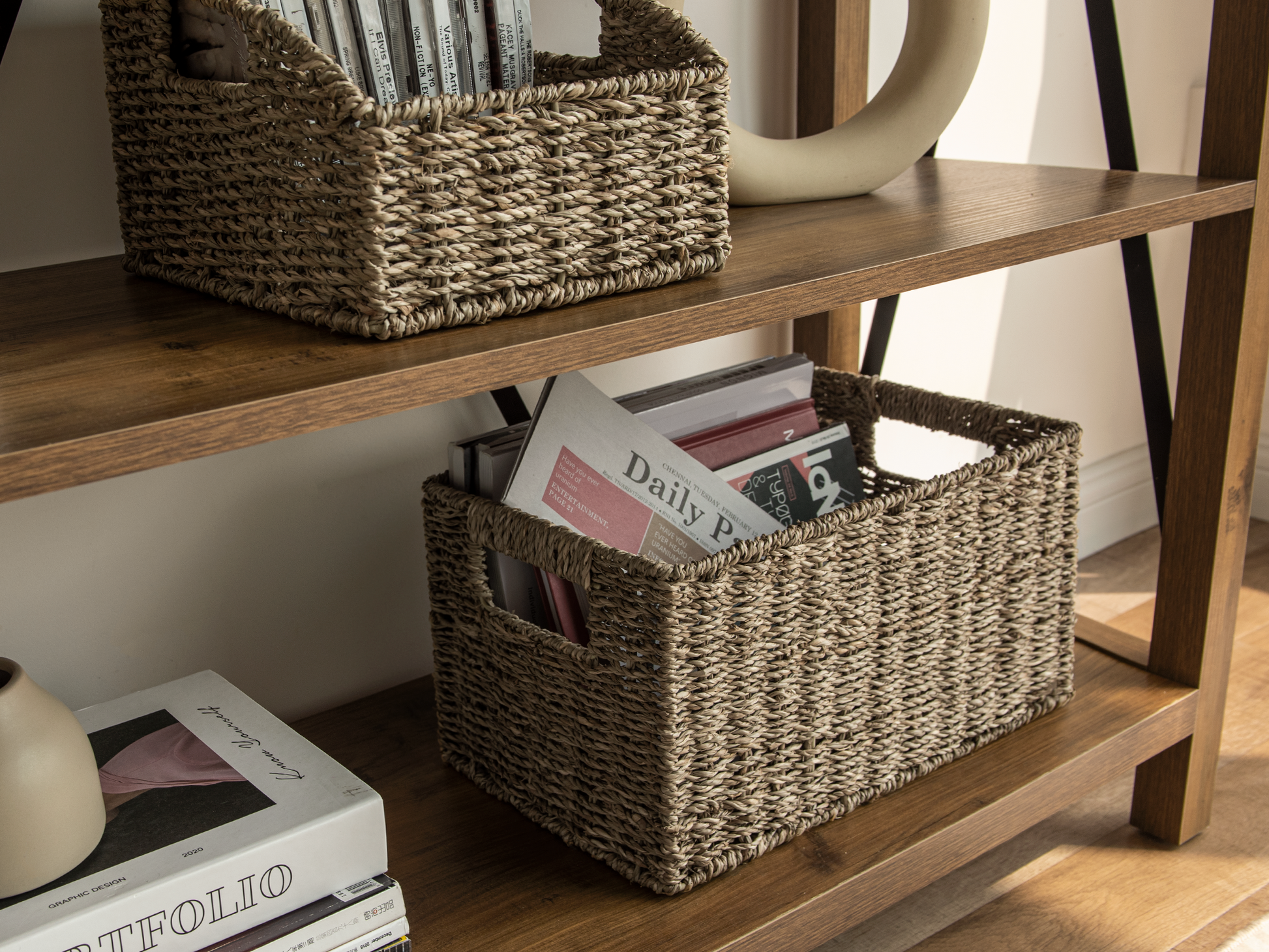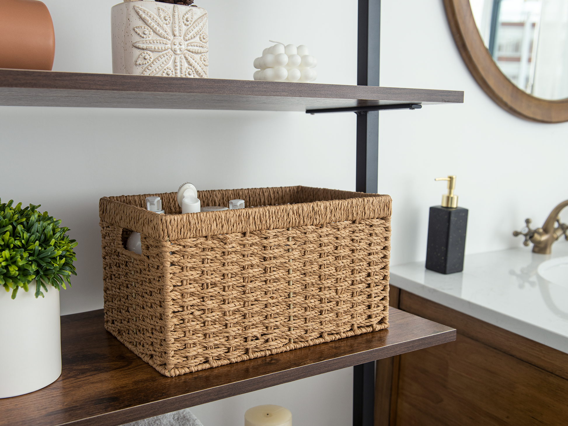 Versatile woven baskets for storing hand towels, toiletries in the bath, or magazines, games, pet toys, media, and household items.