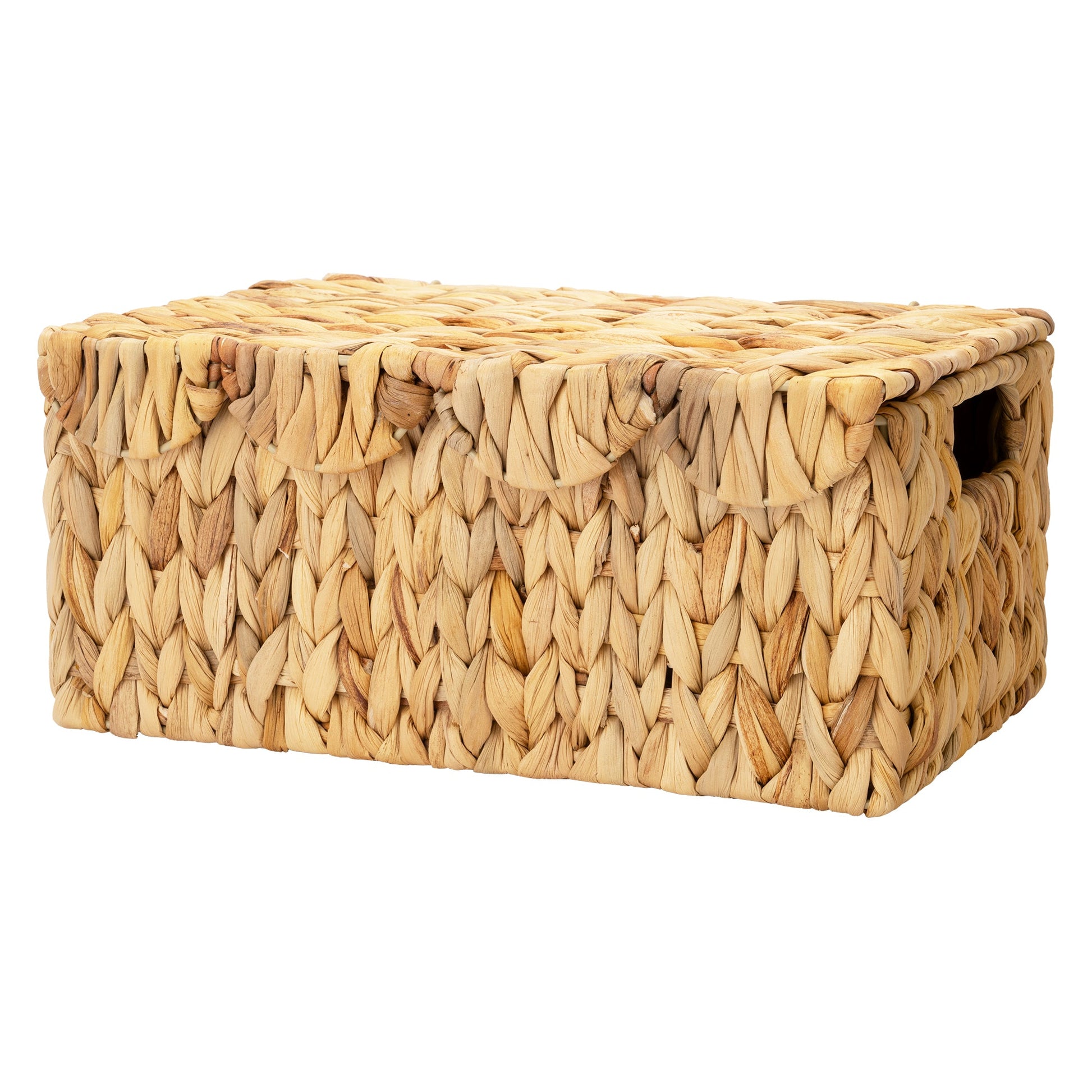 Natural Material : Handwoven wicker baskets with scalloped-edge lids are crafted from natural materials like water hyacinth, blending traditional weaving techniques with modern design for practicality and beauty.